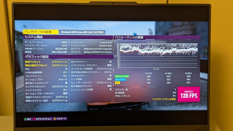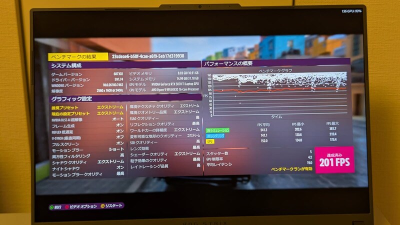 GeForce RTX 50シリーズのGPUは、AIを活用してグラフィックス品質を維持・向上させつつフレームレートを向上する技術、NVIDIA DLSSの恩恵が最大限受けられる点にも注目。最大4倍のフレーム生成により、「Forza Horizon 5」のベンチマークはデフォルトで128fpsのところ、201fpsのスコアを得ることができました。