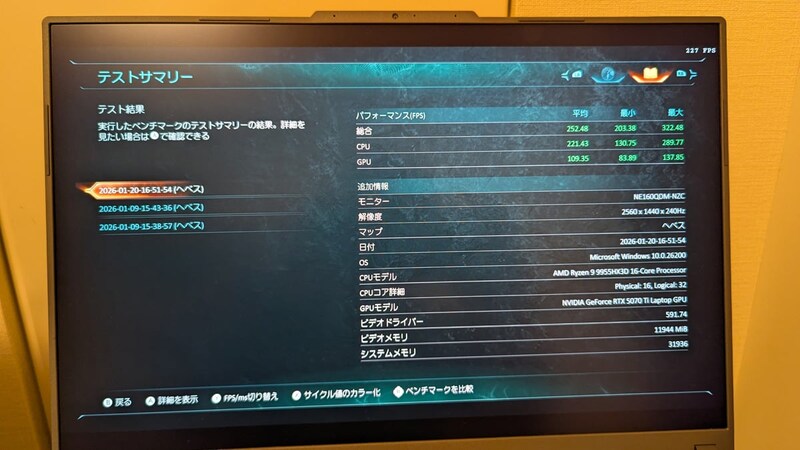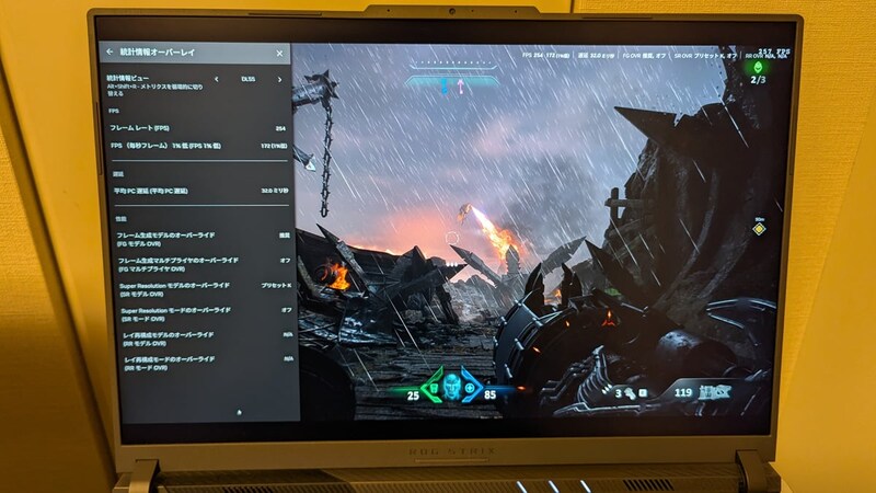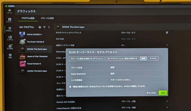 2025年1月にリリースされたばかりのアップデート、DLSS 4.5も試してみました。NVIDAアプリケーションのグラフィックス設定「DLSSオーバーライド」の項目で「推奨」を選択することにより、対応するタイトルでは最新の技術を適用可能。「DOOM: The Dark Ages」ではベンチマーク(ヘベス)で総合252.48のスコアを記録し、200fps超の滑らかで美しいグラフィックスのゲームプレイが楽しめました。DLSS 4.5では、今春には最大6倍のフレーム生成に対応予定なので、今後さらに進化したグラフィックスによる快適なプレイが期待できます。