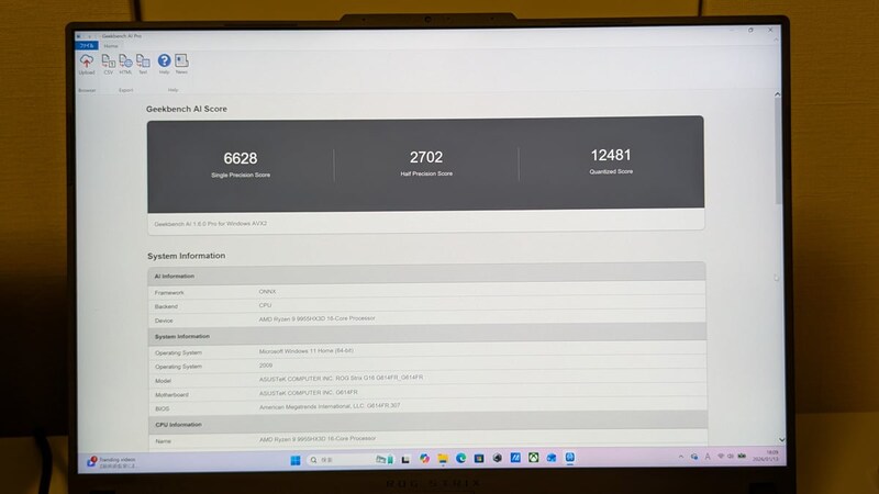 ROG Strixシリーズの2025年モデルは、キーボードにはCopilotキーを搭載。AI PCとしての側面にも注目できます。「Geekbench AI」によるONNX CPUのベンチマーク結果は、Single Precision Scoreが6628、Half Precision Scoreが2702、Quantized Scoreが12481と高いスコアを記録。AI処理でも良好なパフォーマンスが期待できます。