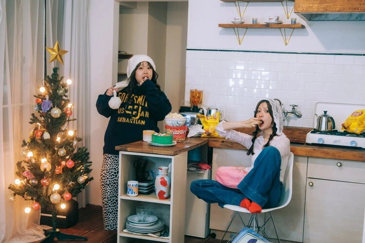 フレアーデニムパンツは着回し。レーストップス 12,980円/LILY BROWN ソックス 1,100円/靴下屋(Tabio)インナー/スタイリスト私物〈左・餅田コシヒカリのコーデ〉セーター 3,959円/WEGO ヒョウ柄スカート 8,910円/LAVEANGE ロングニット帽 13,200円/OVERRIDE(OVERRIDE神宮前)