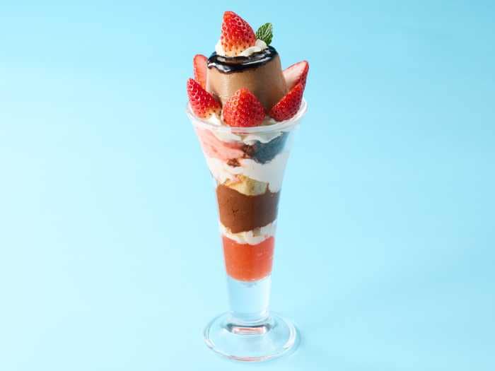 ミニサイズながら、いちごシャーベットやベルギーチョコアイス、チョコプリン、いちごゼリーを重ねた満足感のある一品です。