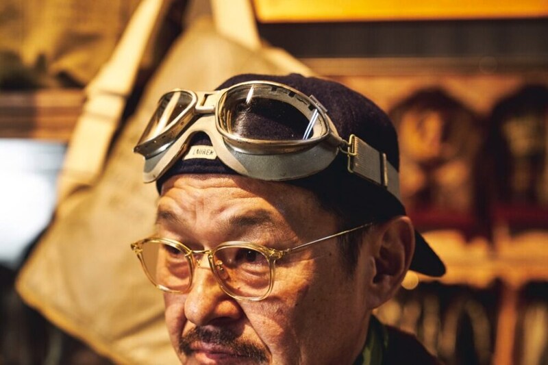 イエローフレームのメガネ、海軍モチーフのキャップにヴィンテージのゴーグルを重ねた顔周りの小物使いはインパクト抜群。当時のパイロットの装いに倣った首元のスカーフや足元のタンクブーツ、スカーフの下でさりげなく主張するネックレスなどもポイントだ。歴史や伝統を理解したうえで装いに取り入れるという、亀屋塾長ならではのエッセンスが随所に光る。
