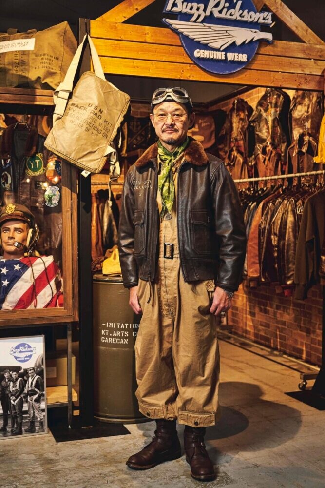 ミリタリースタイルを語るうえで、本誌ライトニング読者が真っ先に思い浮かべる存在が、「バズリクソンズ」の亀屋塾長であろう。この日の装いはフライトスーツの上からG-1を羽織ったリアルなパイロットスタイル。キャップの上に重ねたゴーグルや首元のネックレスとスカーフなど、ミリタリーを深く知る亀屋塾長ならではの小物使いも見逃せない。