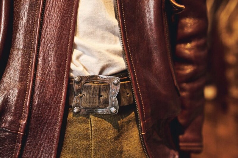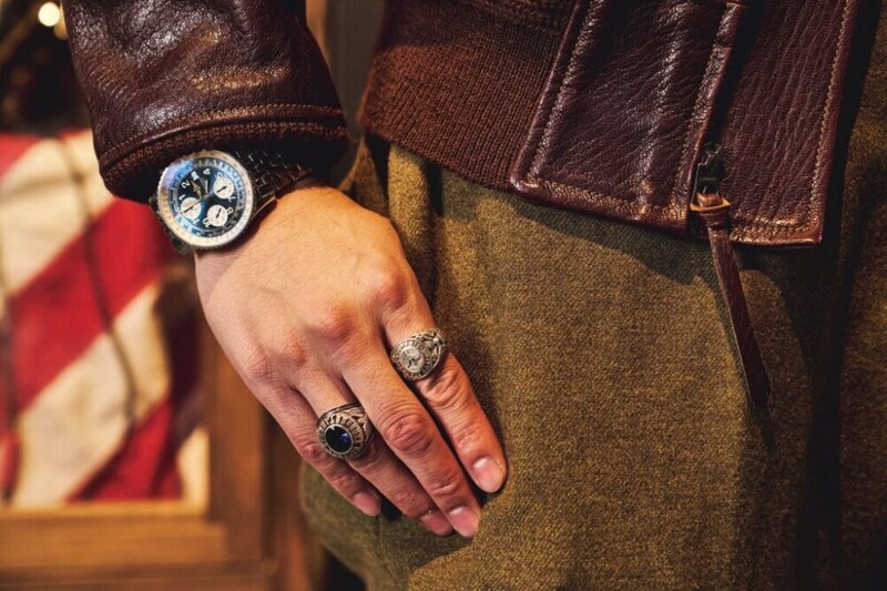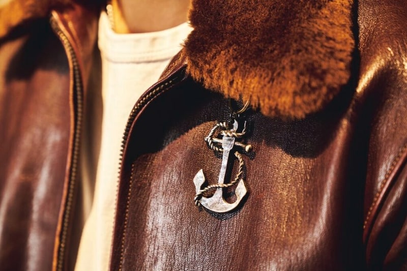 フライトジャケットの首元にアクセサリーをさりげなく効かせるのが佐々木さんのマイルール。この日は主に米海軍で採用されたAN6552に合わせてアンカーのシルバーチャームをチョイス。ほかにも存在感のあるバックルが特徴的なベルトやパイロットウォッチ、シグネットリングなど、無骨なフライトジャケットに合わせてラギッドなテイストの小物を選んでいる