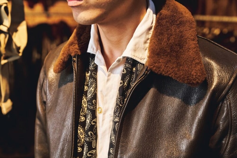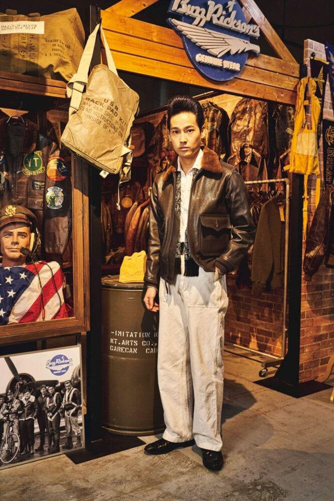 「リーゼントに革ジャン、ホワイトのパンツは『横浜銀蝿』をイメージしました。クラシックな装いが好きなので、フライトジャケットを着る際も中にシャツを着たり、ペイズリー柄のスカーフを垂らしたりと、自分なりにクラシックを解釈し、合わせるアイテムを選んでいます」