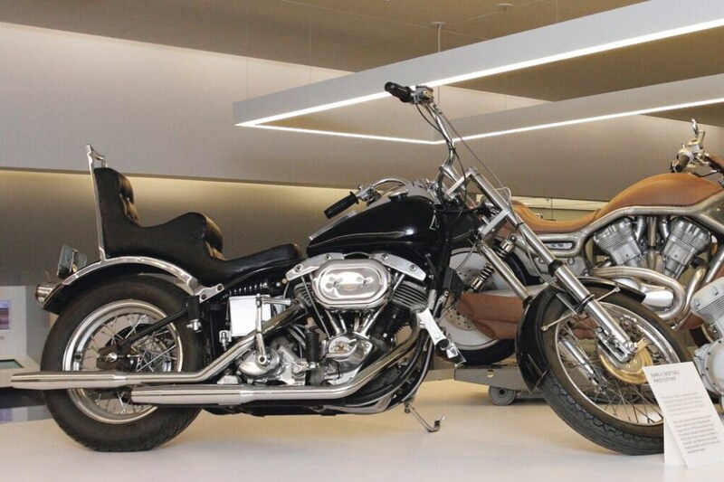 ハーレー社はソフテイルを開発する際、およそ12種のプロトタイプを製作した。これはミルウォーキーにあるH-Dミュージアムに展示されているそのうちの1台で、シート下にリアショックを備えているのが特徴。外部からリアショックが見えてしまっている点や、シート下の馬蹄型のオイルタンク形状など、より“らしく見せる”うえでビル・デイビスが考案したサブショックは優れていたのだろう。