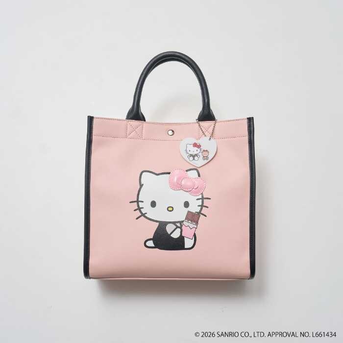 アクリルチャーム付きトートバッグ(品番:GIX36050)は価格5,489円、サイズはフリー、カラーはピンク。チョコレートを持ったハローキティのプリントが印象的で、大容量なのも魅力です。