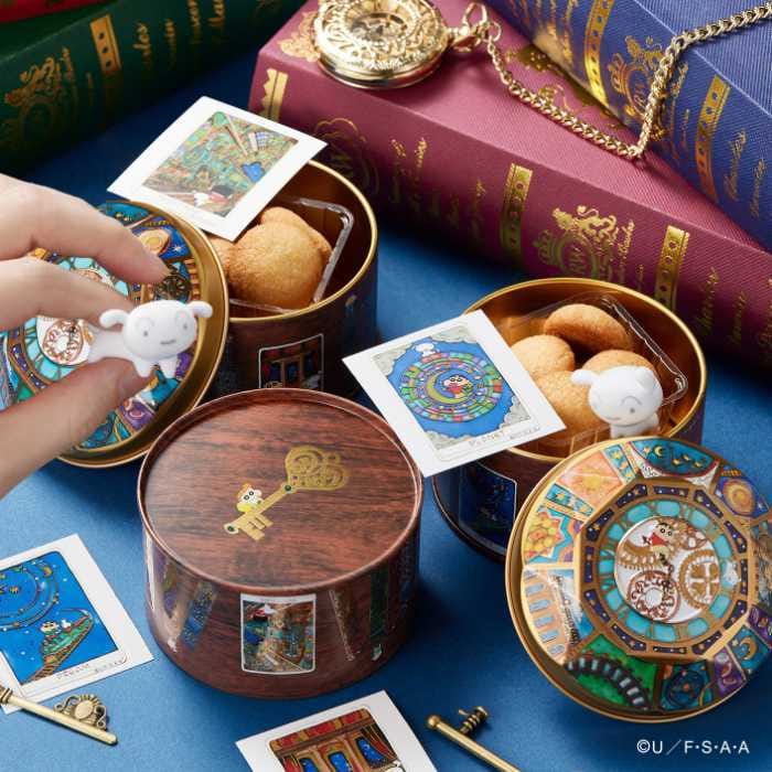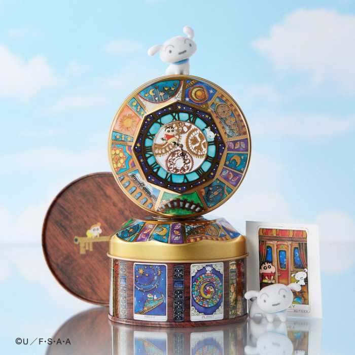 缶の蓋面にはアンティーク風の歯車時計がデザインされ、中央ではミニチュアのしんちゃんとシロが遊ぶ姿が描かれています♡