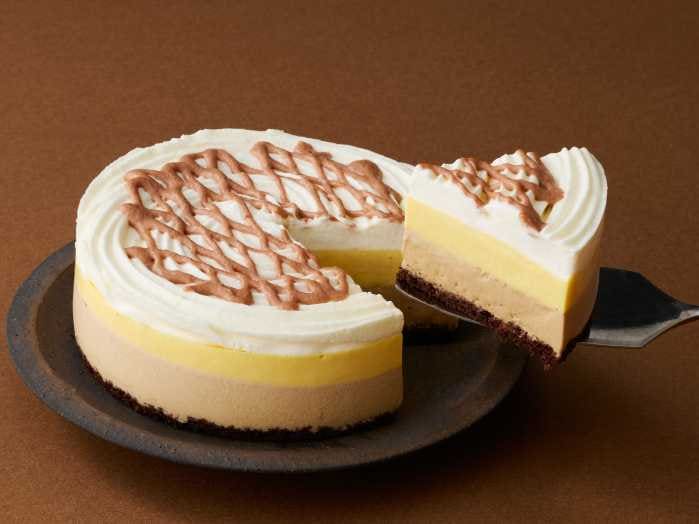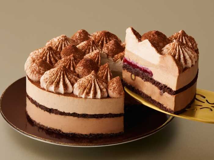 カフェモカムースと、バニラ香るカスタードプリンを重ねたムースケーキ。コーヒーのほろ苦さとチョコの甘さを、生クリームがやさしく包み込み、なめらかな口どけを楽しめます。