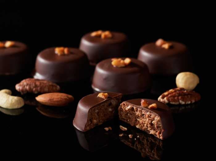 ナッツペースト入りのチョコに、3種のナッツとフィアンティーヌを詰め込んだ、香ばしさと食べ応えを楽しめる一粒。