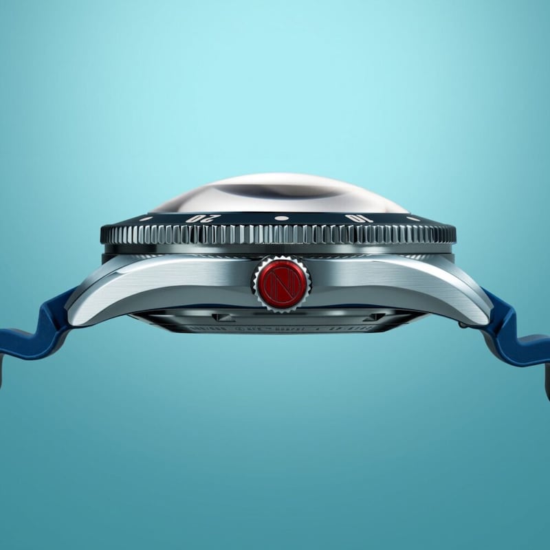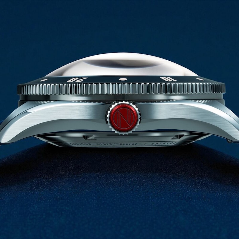 風防には、大きく突出したスーパードーム型サファイアレンズを採用。角度をつけて覗くと歪んで見えるその表情は、潜水艇の舷窓を思わせる。逆回転防止ベゼルには艶やかなセラミックを使用し、30気圧防水という高い耐久性を備えている。