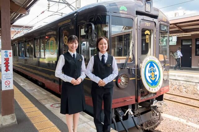「丹後くろまつ号」は1989年から1990年に製造された京都丹後鉄道のKTR700形で、2014年にレストラン列車にリニューアル。新幹線や豪華寝台列車「ななつ星 in 九州」を手がけた工業デザイナー水戸岡鋭治氏のデザインです。今回は最終便の「海上自衛隊 舞鶴地方隊コラボコース」に合わせ、錨の左右に鶴が向き合う舞鶴地方隊の部隊マークと、護衛艦「みょうこう」が車両のヘッドマークになっています。