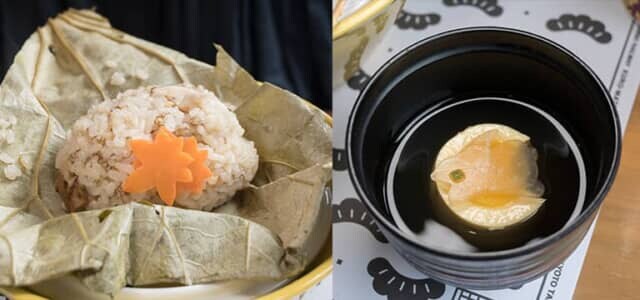 ▲「蓮の葉蒸し もち麦入り季節の炊き込み御飯」と「清汁仕立て 三日月豆腐 南瓜 兎大根 口柚子」