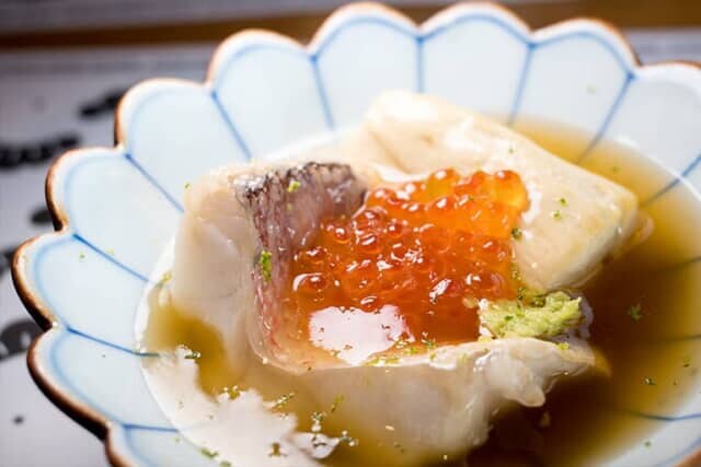 フワフワと軽やかな羽衣を東寺(湯葉の別名)で表現した一品。京都の高級食材とされるぐじ(甘鯛の京都名)を蒸し上げ、鰹出汁の効いた銀餡をかけてたっぷりのイクラとワサビを添え、山椒や柚子の風味が印象に残る逸品です。
