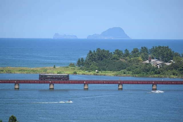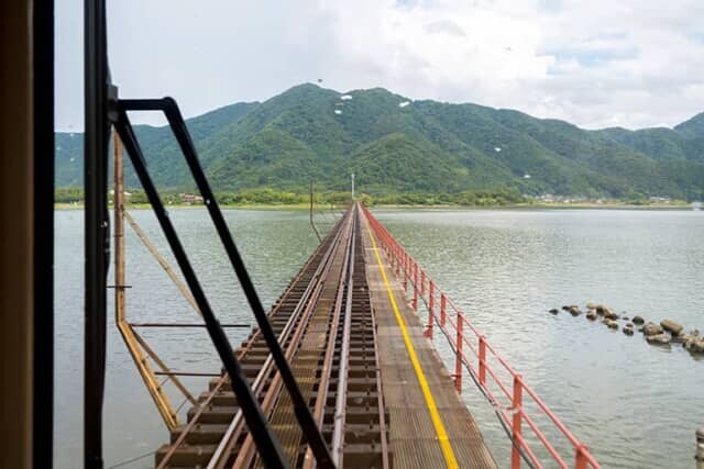 由良川の河口を一直線に通る由良川橋梁。水面から線路の高さはわずか6m。客席の窓からは海の上を渡っているように見える人気のスポットです。