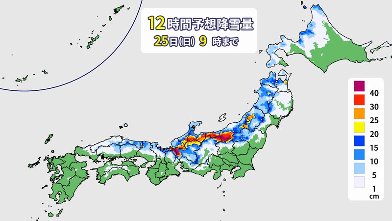 24日(土)は、明け方から朝にJPCZが山形県付近を指向する予想です。山形県の中西部や福島県の会津地方では雪が一時強く降る可能性があるでしょう。朝にかけても20センチから30センチほど雪が積もるところもありそうです。一方、東北北部や奥羽山脈はあまり雪は降らず、晴れ間が出ることもありそうです。朝にかけても、東北北部や奥羽山脈沿いは積雪はあまり多くは増えないでしょう。