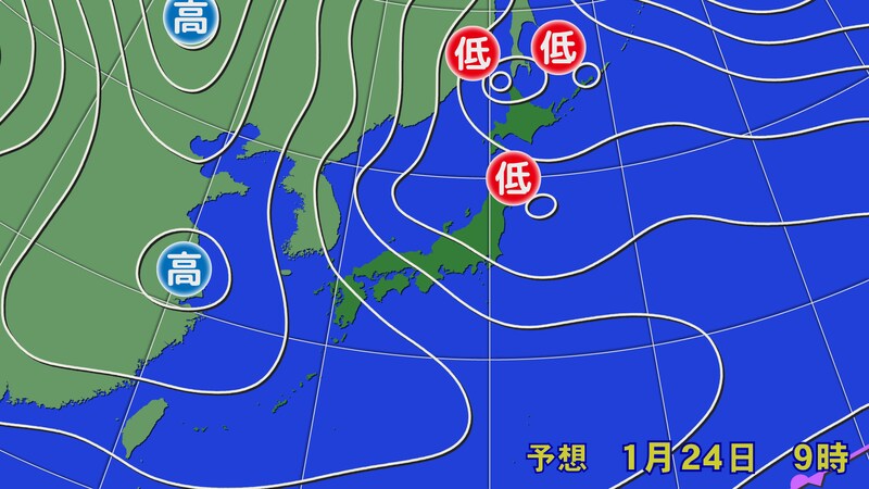 24日(土)の夜に小低気圧が宗谷地方を通過、日曜日は西寄りの風で雪が降る見込み。日本海側を中心に朝にかけて雪が積もり、日中も雪が降ったり止んだりでしょう。