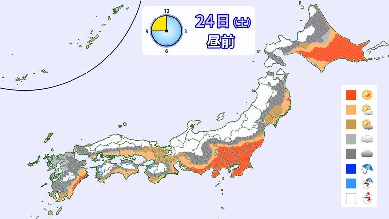 24日(土)は、JPCZが北陸から東北南部を指向する見込みです。日本海沿岸部で降雪が多くなり、内陸は雪があまり降らないところがあるでしょう。