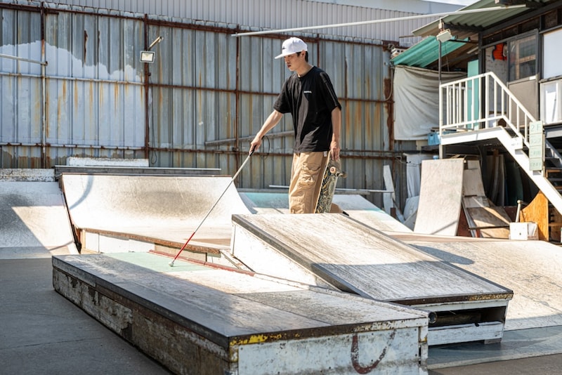 スケートパークに到着したら必ず行う白杖を使ったコースチェック。これで距離感や感覚を掴んでからトライしているそう――スケートボードをする際の工夫や、周囲に意識して伝えていることはありますか?