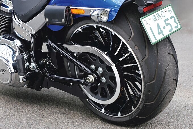 このモデルの個性にもなっている240㎜という極太なリアタイヤ。幅広な後輪に合わせてフレームは「ファットボーイ」と同様シート下がワイドなタイプを採用する。