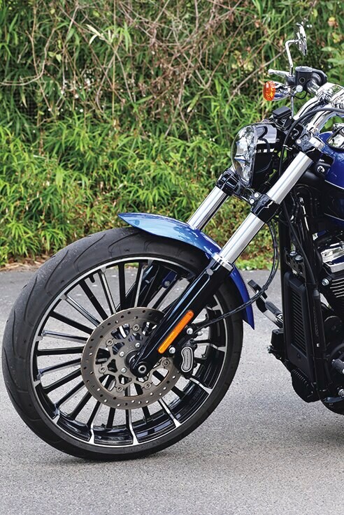 フロントホイールには大径の21インチを採用。タイヤサイズは130とリアに負けない太めを履く。ホイールデザインは2023年モデルから変更された。