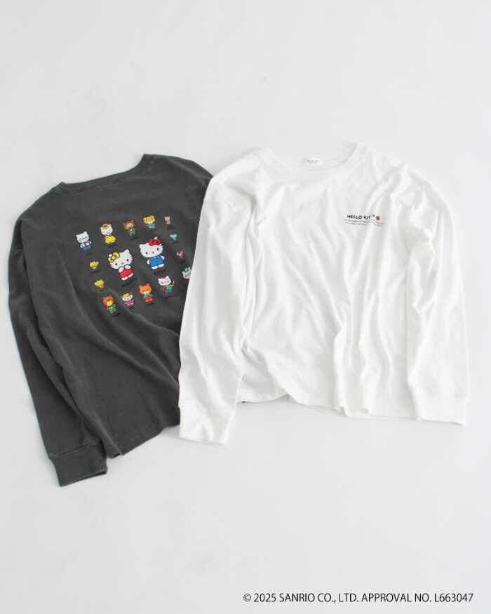 プリントロングTシャツ(オフ/チャコール・税込4,400円)はバックプリントにハローキティとお友だちをあしらい、ヴィンテージライクな加工で大人カジュアルに。