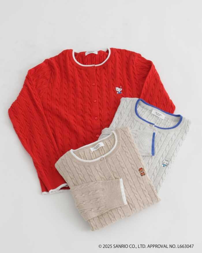 ハローキティ、ディアダニエル、タイニーチャムをイメージした秋カラーの刺繍入りケーブルカーディガン(レッド/ベージュ/グレー・税込5,500円)は、ベーシックな丈感でどんなボトムスにも合わせやすい1枚♡
