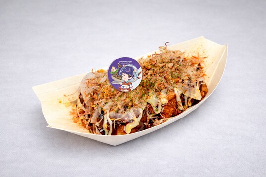 たこ焼き、スライスオニオン、フライドオニオン、お好みソース、マヨネーズ、鰹節、青のり