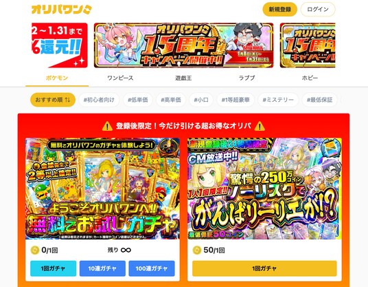 オリパワンは、オンラインで手軽にガチャを楽しめるオリパ専門サービスです。