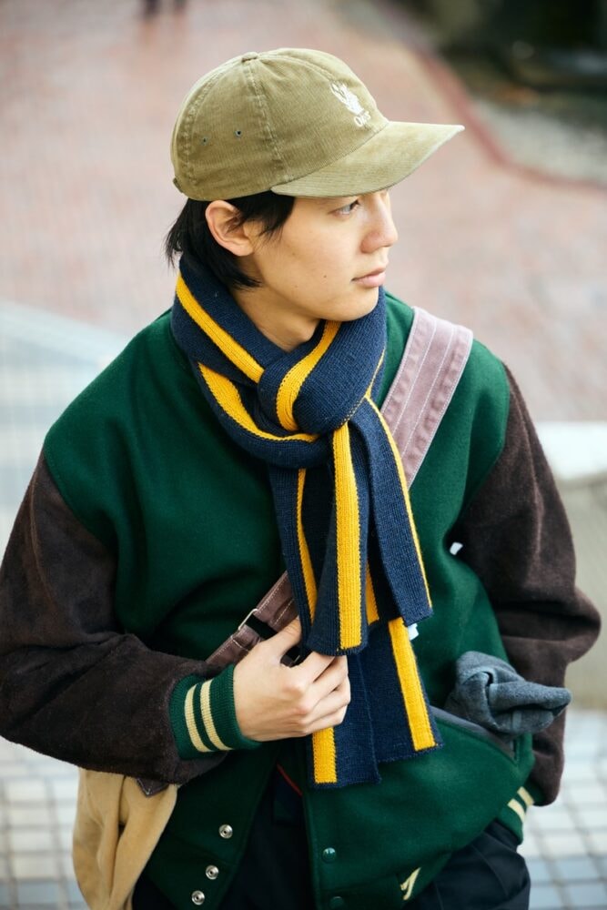 昨年大好評を博したコラボレーション第1弾、ヘビーデューティなトラッドスタイルと相性の良い「バーズアイニットマフラー」。その流れを汲み、今回の第2弾では、ヴィンテージのスクールマフラーに着想を得た「トラディショナル スクールマフラー」を製作しました。アメトラの王道配色であるネイビー×イエローを、素直に落とし込んだ1本です。