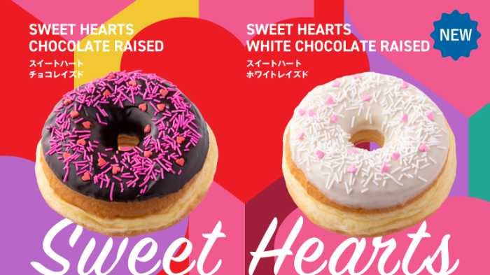 どちらもレイズド生地にチョコレートをコーティングし、ハート型モチーフとスプリンクルで華やかに仕上げた季節限定ドーナツです。