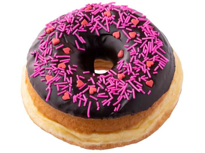 どちらもレイズド生地にチョコレートをコーティングし、ハート型モチーフとスプリンクルで華やかに仕上げた季節限定ドーナツです。