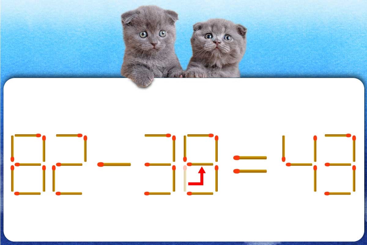 「0」のマッチ棒を1本、移動させて「9」を作り「82-39=43」にする。
