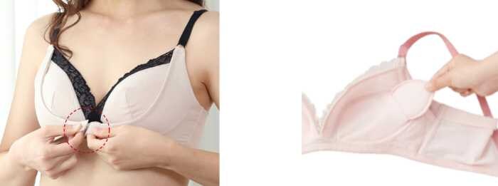 『卒乳するバストを応援ノンワイヤーブラ』は、締め付けにくいノンワイヤー設計を採用。フロントはホック式でサイズ感やサポート力を調節しやすく、取り外し可能なパッドで好みに合わせた着用が可能です。
