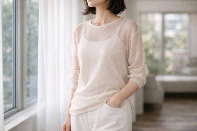 春トレンドの定番になりつつあるシアー素材ですが、透け感が強すぎると大人世代には少しハードルが高め。そこでおすすめなのが、インナーがほんのり透ける程度の薄手ニットタイプです。