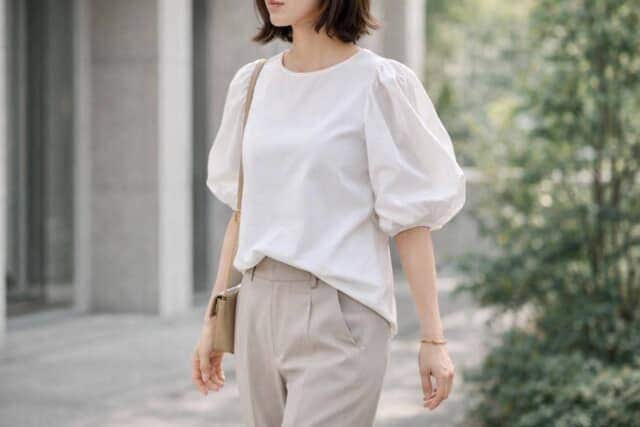 甘さ控えめの「立体スリーブブラウス」で更新感を