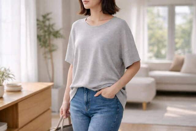 ハリが強すぎない素材なら、デニム合わせでもラフになりすぎず、きれいめカジュアルな仕上がりに。色はグレーやライトベージュなど、顔映りのいいニュアンスカラーを選ぶと大人っぽさもキープできます。