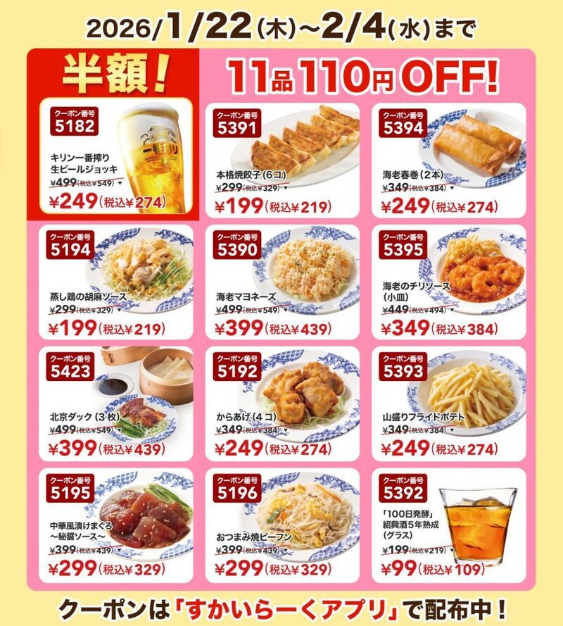 バーミヤンの公式Xは、2026年1月22日から2月4日までの期間限定で、生ビール半額と11品が110円引きになるクーポンを公開しています。
