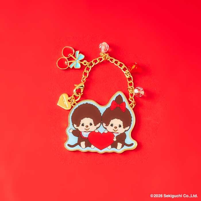 「モンチッチくん」「モンチッチちゃん」の愛らしいモチーフや、チェリーとビーズを組み合わせたカラフルなチェーンがポイントです。