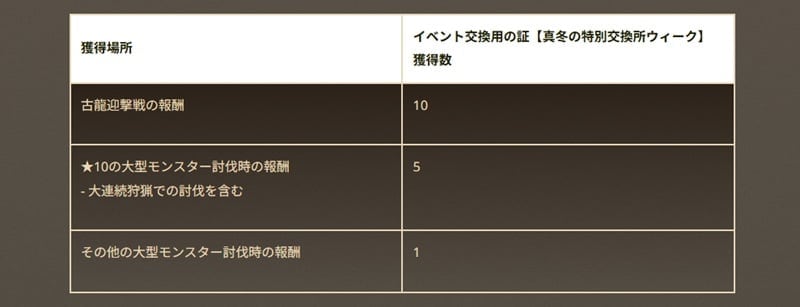今回紹介する“真冬の特別交換所ウィーク”は、特定の狩猟や討伐などの報酬で獲得するポイントと引き換えにアイテムをゲットできる期間限定のイベント。