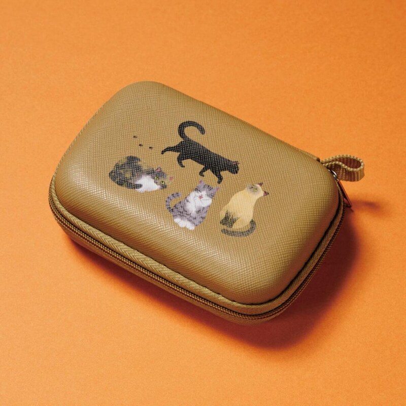 4匹の猫が描かれたガジェットケースも付いています。アクセサリーやイヤホンなどの小物の持ち運びに便利です。
