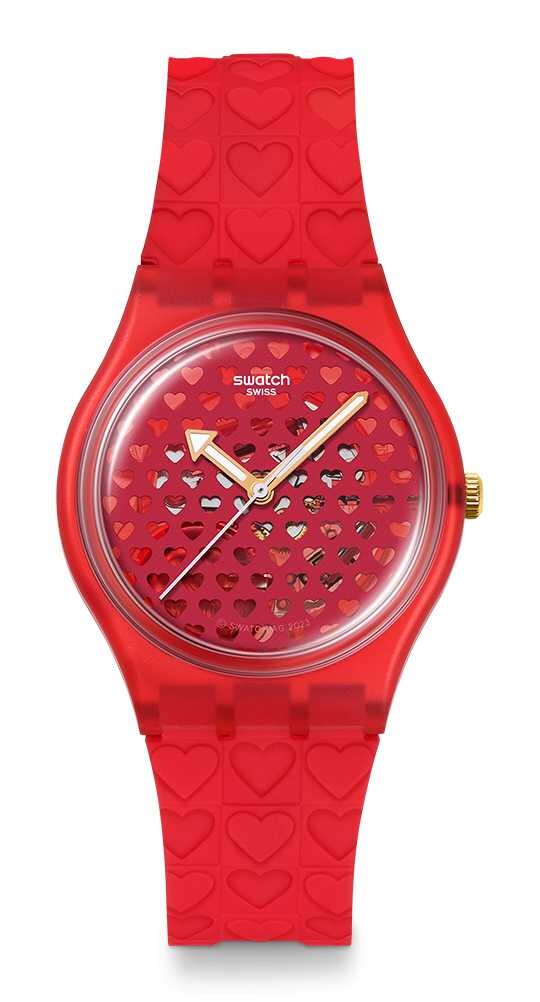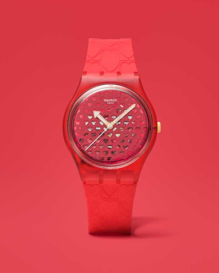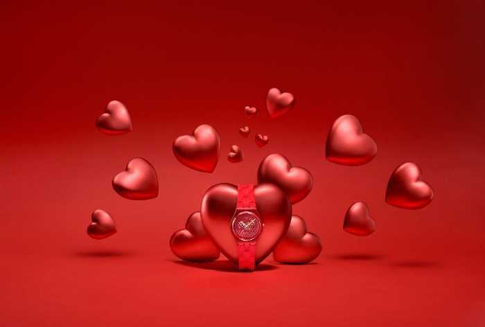 「LOVE IN SCARLET」は、昔ながらのバレンタインのときめきを現代的に表現したモデル。直径34mmのマット仕上げ透明レッドケースに、ハート型カットアウトを施した文字盤が印象的です。