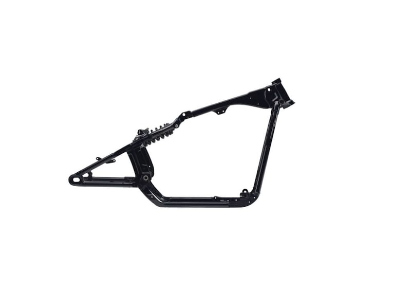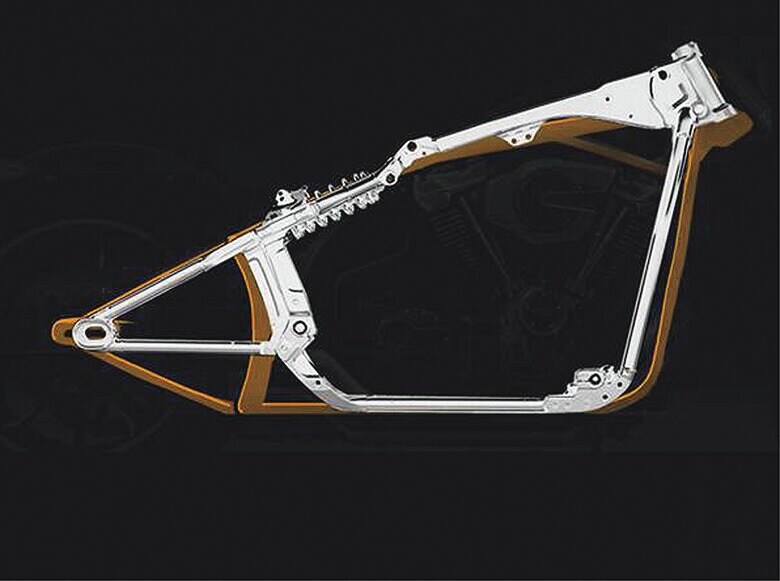 「こんなハーレーがほしい」というユーザーのさまざまな要望に応えることを目指して、単なるクラシック風だけでなく多種多様なモデルに対応するように進化したのが現行型のフレームだ。旧型と比較すると(写真右・白/現行型、オレンジ/旧型)ネックとバックボーンの位置が高く、さらにダウンチューブ(下側)の前後長が短くなった。さらに注目はリアショックのモノサス化とスイングアームのスリム化。リジッドフレーム由来のシルエットだった旧型に比べて、大幅に洗練されたことがわかる。見た目以外にも、フレームの剛性が大幅にアップしたほか、軽量化も実現するなど走りの性能に直結する部分も進化している。