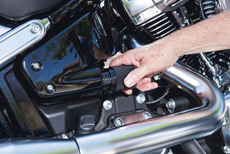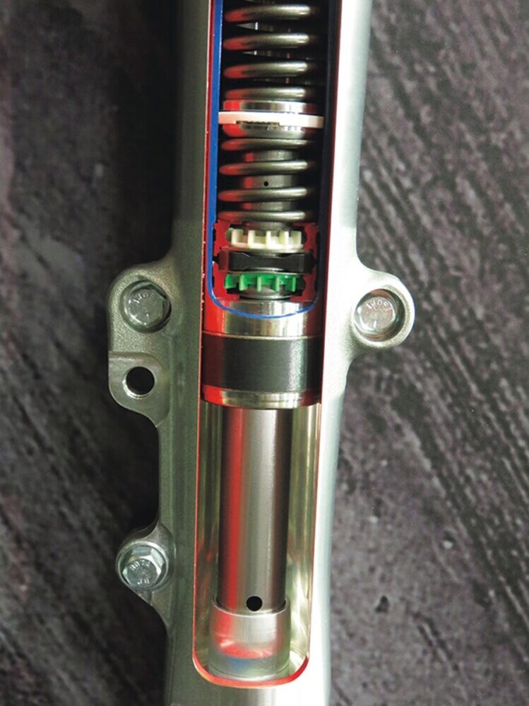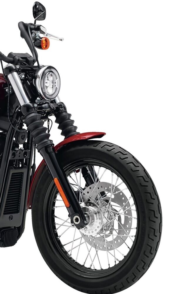 旧型のフロントフォークは、いわゆる“昔ながらのハーレー”という印象で、少し強めにフロントブレーキをかければ途端にフルボトムしてしまうぐらいに柔らかった。しかし、現行型ではそれがだいぶ改善されている。なぜなら、ボトムケース内部に新たにSHOWA製デュアルベンディングバルブが採用されたためだ。これはシンプルな機構ながらも高性能サスに匹敵する減衰力を発生させ、デコボコをしなやかに吸収。また、しっかりと踏ん張るようになったので昔のハーレーのようなリアブレーキ主体の乗り方ではなく、フロントブレーキを積極的に使える操縦性へと進化しているのだ。