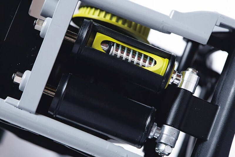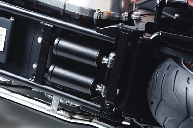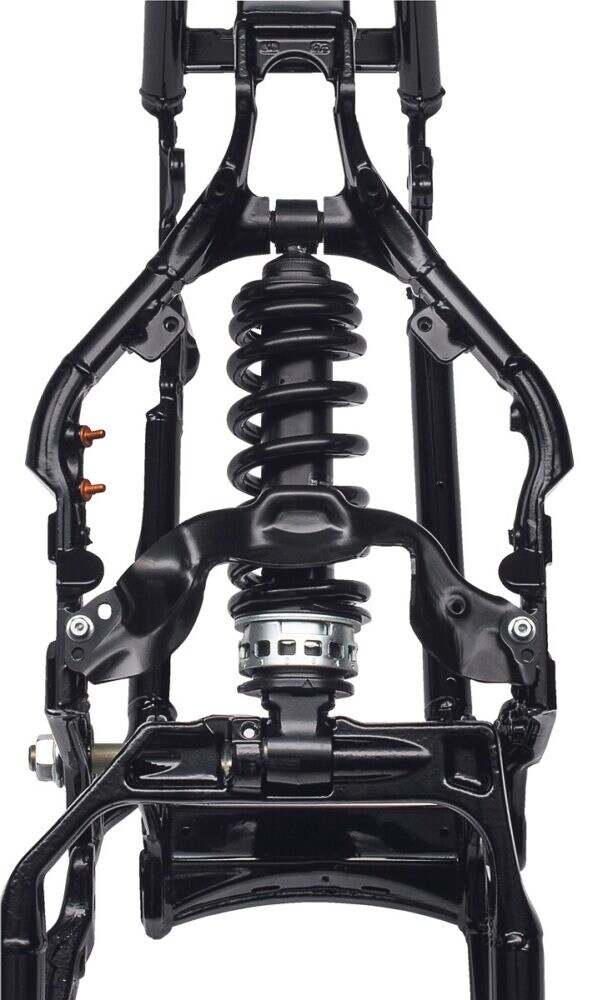 通常とは逆方向に可動するリアショックだった旧型とは異なり、現行型はスイングアームの上部に取り付けられたため、サスペンションの動きが自然に。また、旧型は路面の段差で底づきしていたが、現行型は十分なストローク量を確保。減衰力もしっかりと効くようになったため、簡単にフルボトムしてしまうことはなくなった。何よりプリロードの調整が簡単にできるので、乗り方や体重、荷物の重さなどに応じてセッティングすることが可能に。90kg以上の荷物を載せてもしなやかに動くように設計されているというから、その進化たるや相当なものだ。