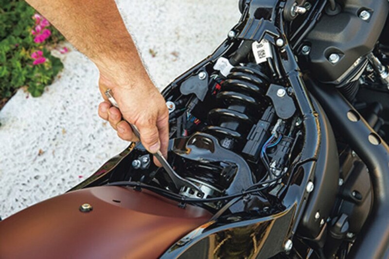 新たに採用されたプリロード調整機能は車種によってその方法が異なるが、マフラー側のサイドカバー下にあるダイヤルを回して調整できるモデルもあって、とてもイージーだ。