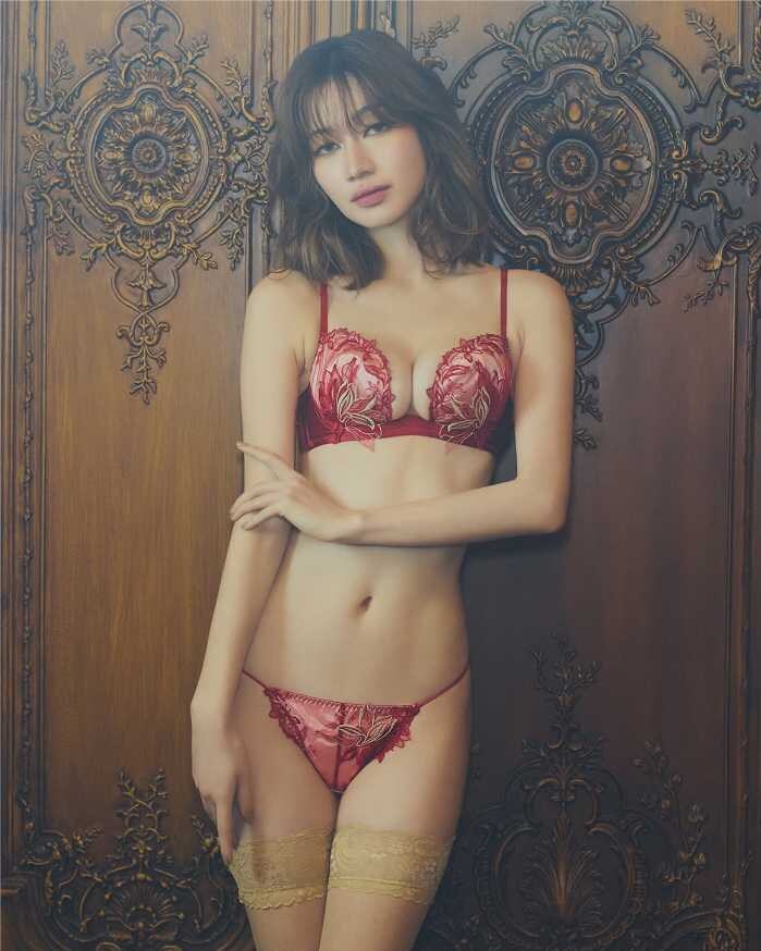 エルザとミリーヌは、異なる表情で女性の強さとしなやかさを表現。エルザホットリフトブラは8,900円、エンブロイダリーレースショーツ・Tバックは3,900円。カラーはブラック/レッド/グリーン。
