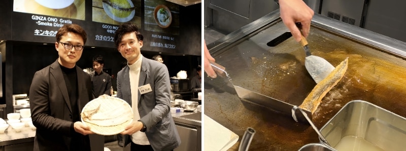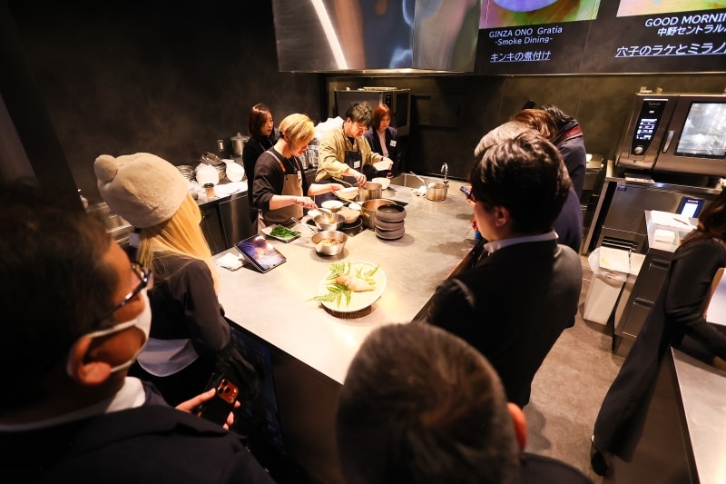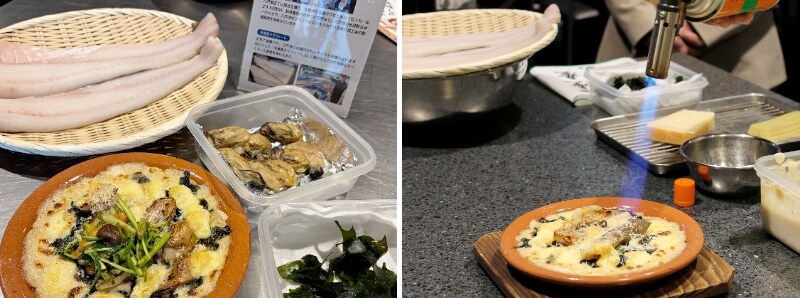 試食会当日は、会場の「Social Kitchen TORANOMON」に3店の参加店舗とそれぞれの食材提供を手がけた水産加工業者の代表者が集結。食材の特徴やメニュー開発のポイントが語られるとともに、提供メニューの実演調理が行われました。