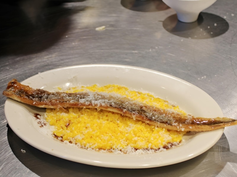 サフランとパルミジャーノで色と香りづけをしたリゾットの上に、鉄板で焼き上げた開き穴子を乗せたミラノ風リゾット。鮮やかな見た目と穴子のこうばしい香りが食欲をそそります。