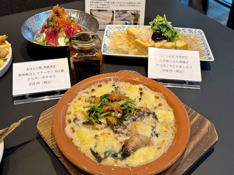 こちらのメニューを味わえるのは「あばら大根 西葛西店」。 「自家製しびれ厚揚げ 気仙沼フカヒレあんかけ」(968円)、「旨味帆立とコラーゲンXO醤 クリチーポテサラ」(858円)も併せて提供されます。